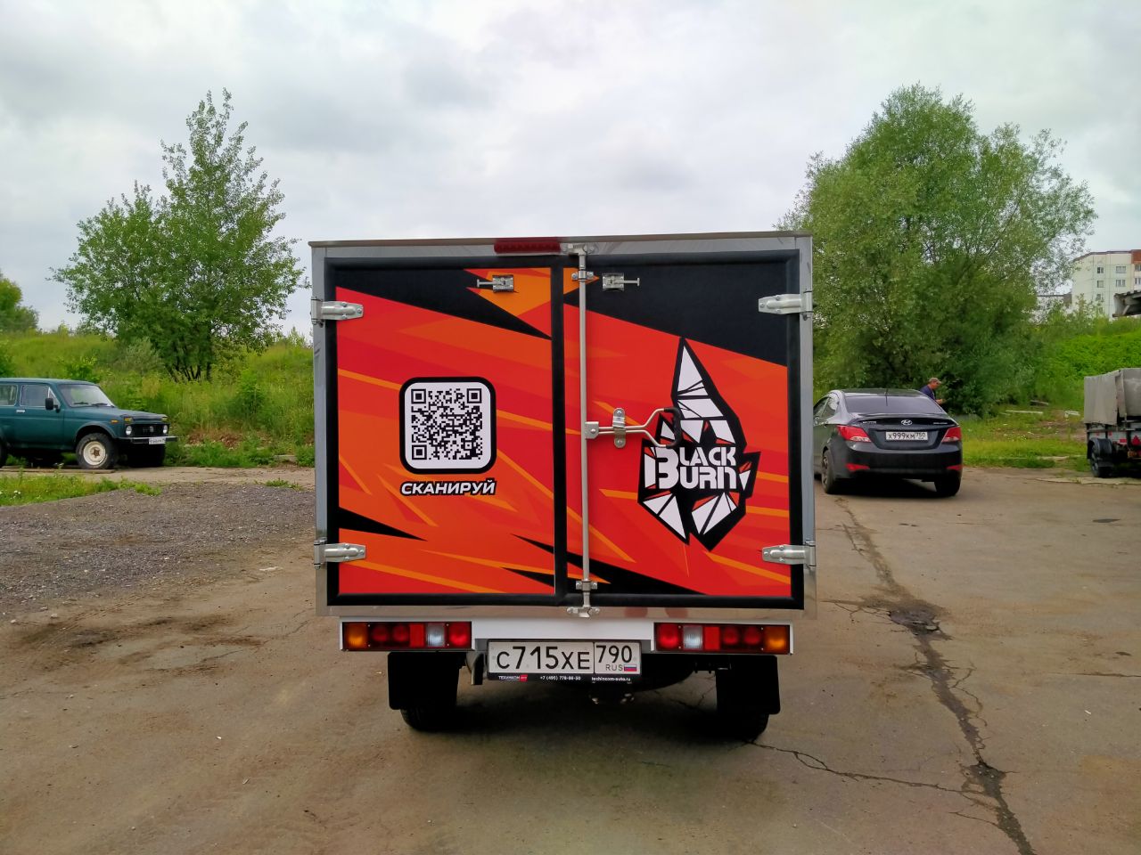 Комбинированный подход — критические зоны (низ бортов, задний бампер) покрываются усиленной защитной пленкой, остальные поверхности оклеиваются стандартным виниловым покрытием с рекламной печатью.