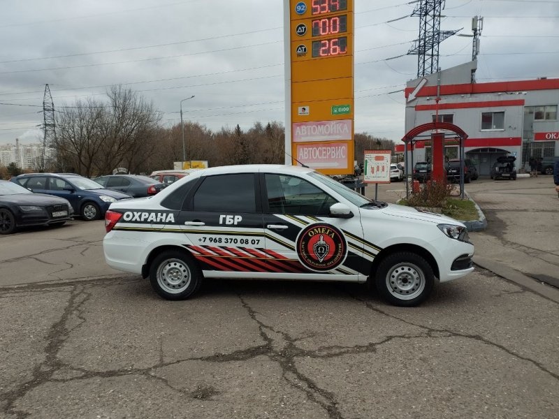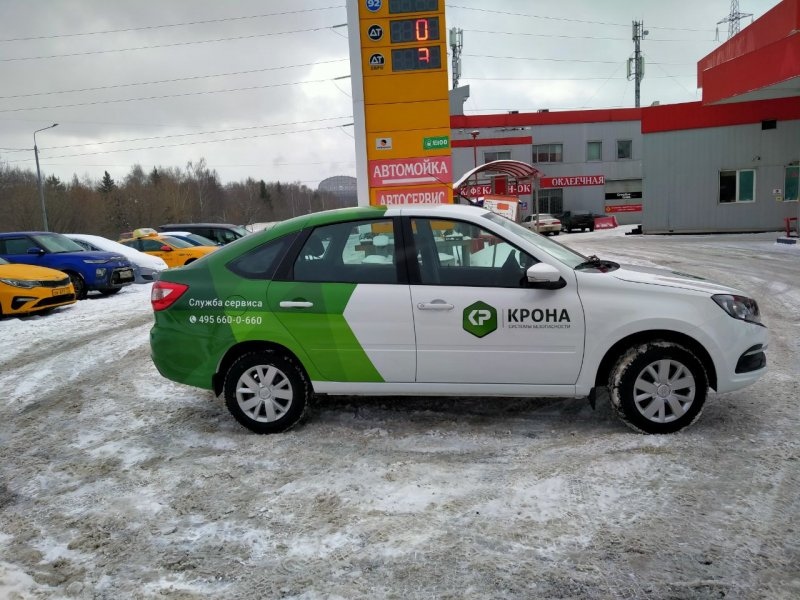 Что это: Полная оклейка всех видимых поверхностей кузова Granty — оба крыла, крыша, передний и задний бампер, даже зеркала. Дизайн может предусматривать смену цвета (например, красная Granta становится белой с синими полосами). Машина выглядит как корпоративное такси или служебный автомобиль компании, узнаваема с расстояния 40+ метров. Срок службы 5-7 лет при использовании полимерных материалов или 7-9 лет при использовании премиум-материалов (Oracal 951, Oraguard 290).