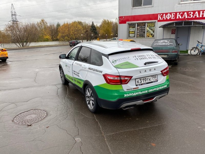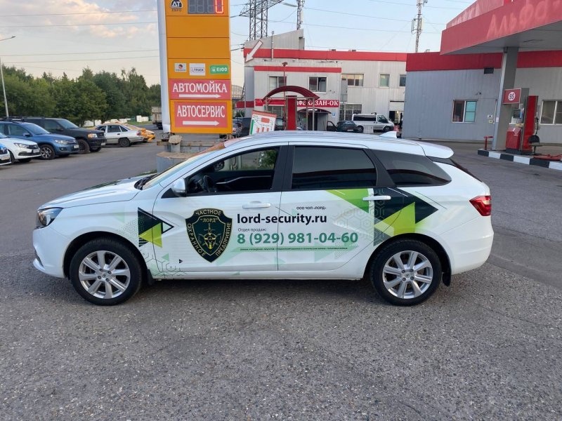 Что это: Логотип компании, нарезанный из однотонной пленки, размещённый на передней двери Vesta + номер телефона на переднем бампере. Минималистичный подход, но для представительской работы всё ещё эффективный — машина выглядит современно.