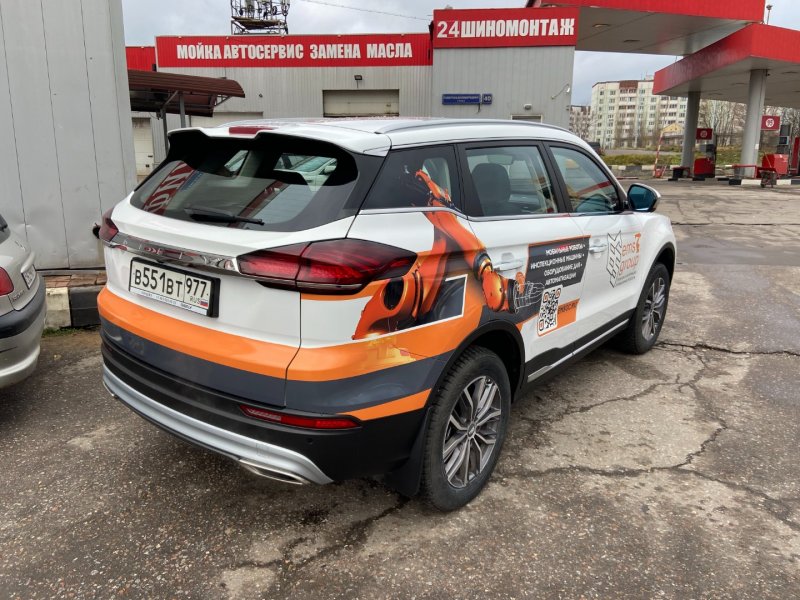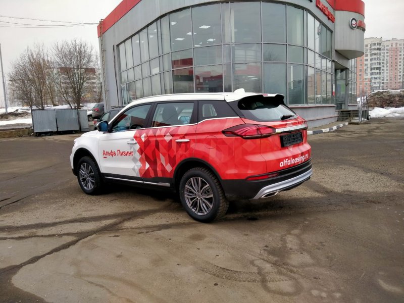 Geely Atlas Pro / Coolray. Кроссоверы для сервисных инженеров и менеджеров среднего звена. Здесь часто применяется частичная оклейка бортов с заходом на заднее крыло (пример: брендирование для «Альфа Лизинг»). Важно учитывать наличие пластикового обвеса.