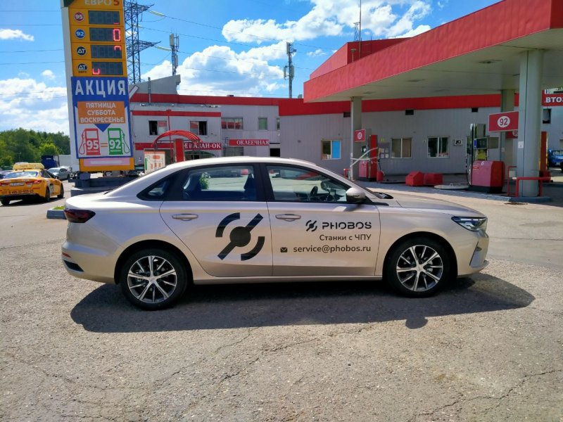 Geely Emgrand. Новый лидер в сегменте такси и автопарков торговых представителей. Классический седан с большой площадью дверей. Идеален для размещения логотипов и контактных данных, как в нашем проекте для компании «Фобос».