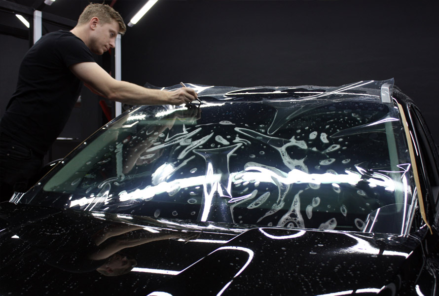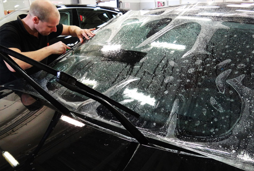 Бронепленка наносится влажным методом, аналогично защиты кузова, но с дополнительными сложностями из-за сферичности стекла.