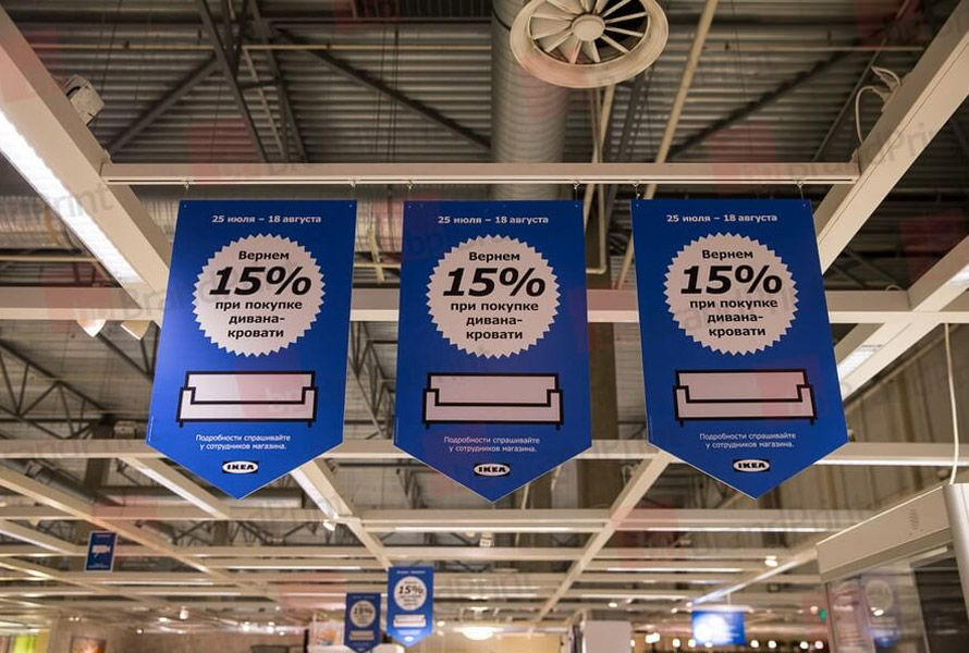 Мобайл – это POSM, отличающийся от других материалов местом расположения. Плакат высокой жесткости подвешивается к потолку торговых залов. Основная задача конструкции – привлечь внимания клиента акциями, распродажами, поэтому в просторных помещениях и торговых центрах размещают много разноуровневой рекламы. Посетителей привлекает элемент навигации, поэтому его созданию уделяется особое внимание.