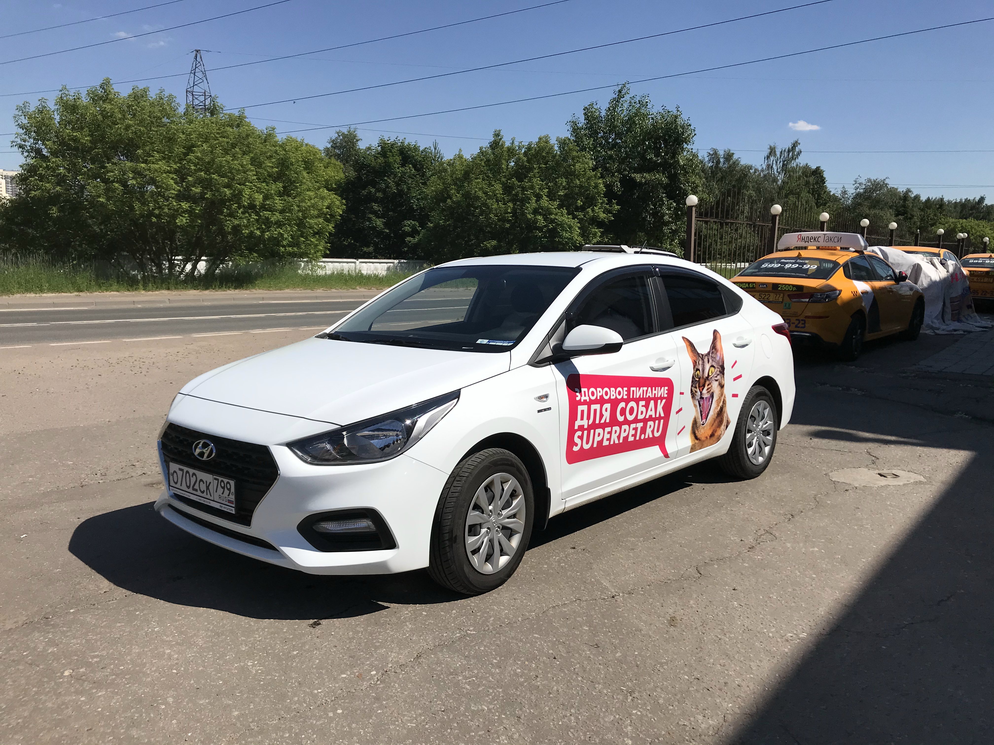 Стандартное брендирование Яндекс.Такси — шашечки и логотип на светлом кузове от восьми до пятнадцати тысяч рублей. Включает плоттерную резку и монтаж всех элементов. Срок выполнения один-два дня.